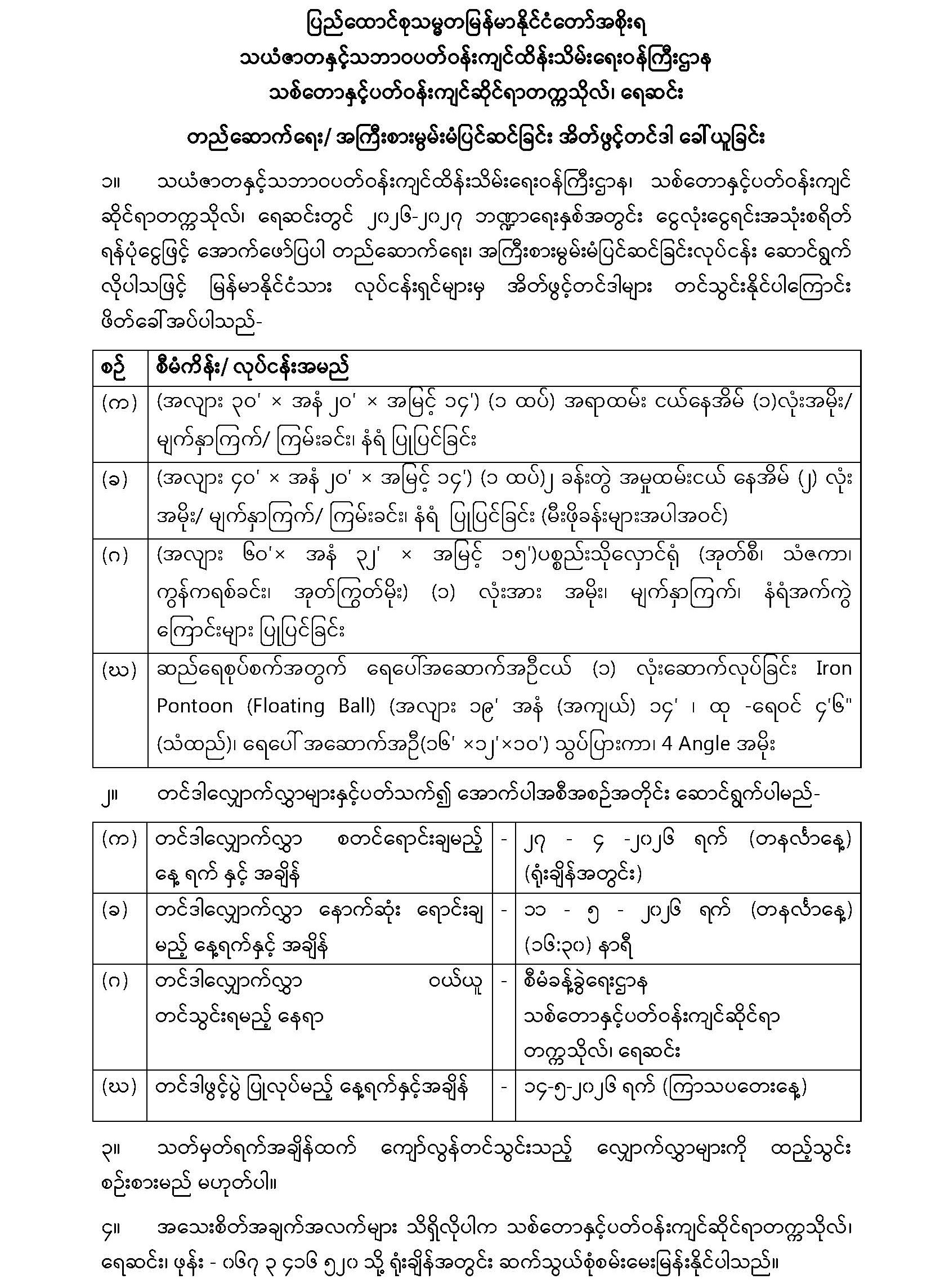 သစ်တောနှင့်ပတ်ဝန်းကျင်ဆိုင်ရာတက္ကသိုလ်၊ ရေဆင်း တည်ဆောက်ရေး/ အကြီးစားမွမ်းမံပြင်ဆင်ခြင်း အိတ်ဖွင့်တင်ဒါ ခေါ်ယူခြင်း