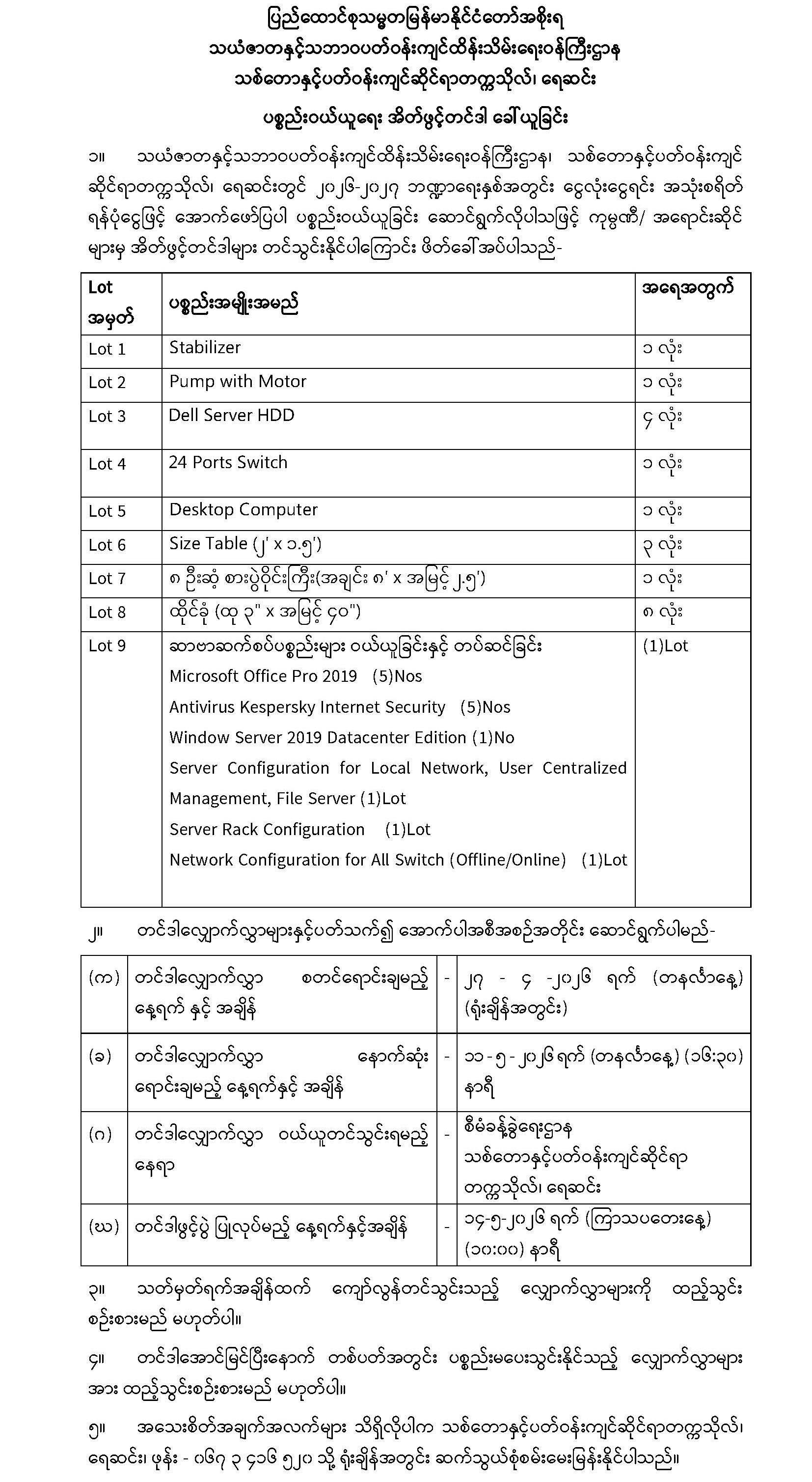 သစ်တောနှင့်ပတ်ဝန်းကျင်ဆိုင်ရာတက္ကသိုလ်၊ ရေဆင်း ပစ္စည်းဝယ်ယူရေး အိတ်ဖွင့်တင်ဒါ ခေါ်ယူခြင်း