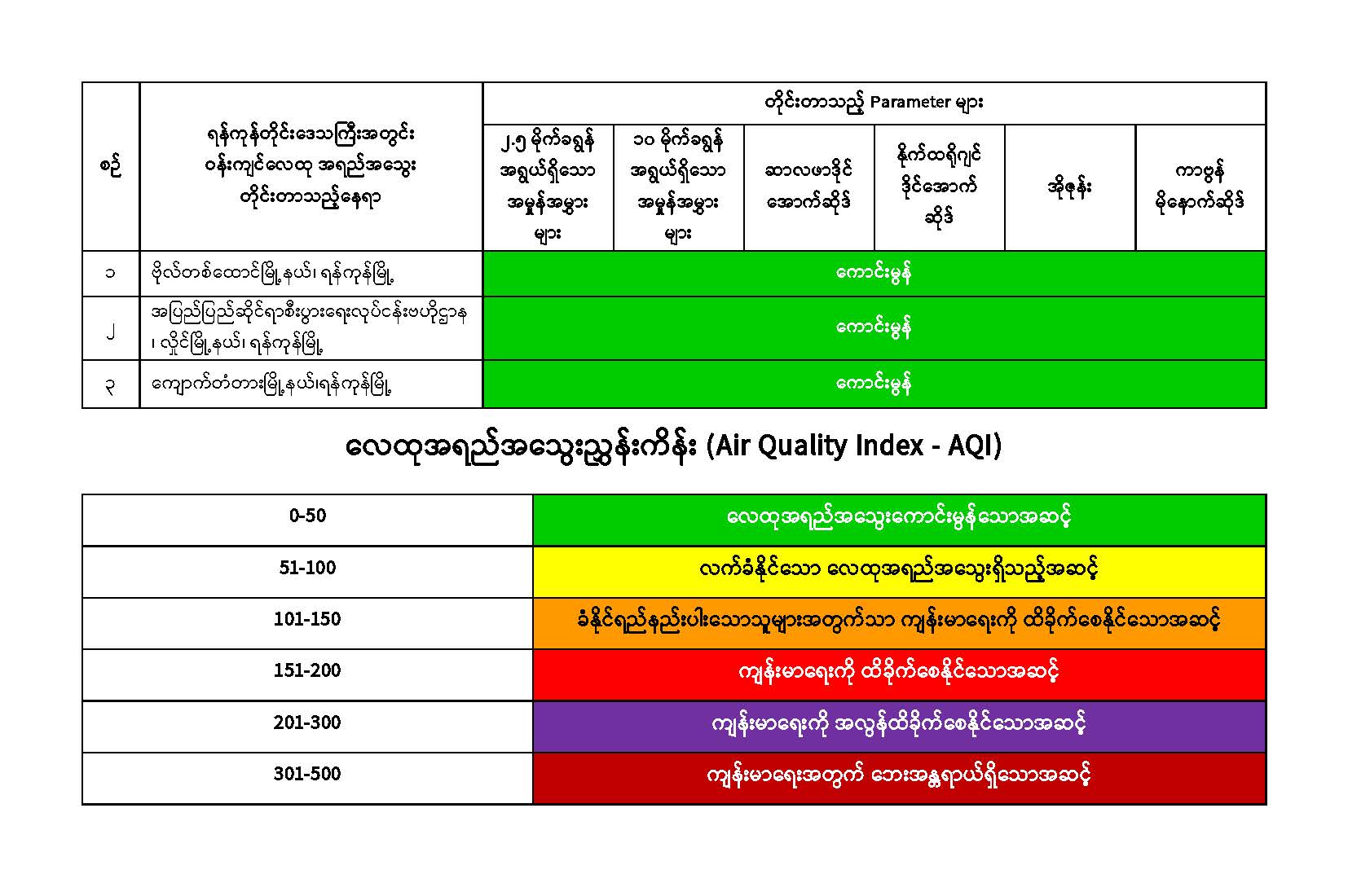 ရန်ကုန်တိုင်းဒေသကြီး၊ ပတ်ဝန်းကျင်ထိန်းသိမ်းရေးဦးစီးဌာနအနေဖြင့် ရန်ကုန်မြို့အတွင်း အောက်ဖော်ပြပါ တိုင်းတာမှတ် (၃) နေရာတွင် Ambient Air Quality Monitoring Station with Mobile Car- (AQMS Mobile Car)၊ Compact Air Quality Monitoring Station- (AQM 65) စက်များကိုအသုံးပြု၍ Particulate Matter 2.5 (PM2.5)၊ Particulate Matter 10 (PM10) ၊ Sulphur Dioxide (SO2)၊ Nitrogen Dioxide (NO2)၊ Ozone (O3) နှင့် Carbon Monoxide (CO) စသည့် အဓိက Parameter (၆) မျိုးကို (၂၄) နာရီ ပုံမှန်တိုင်းတာပြီး လေ့လာဆန်းစစ်လျက်ရှိပါသည်။